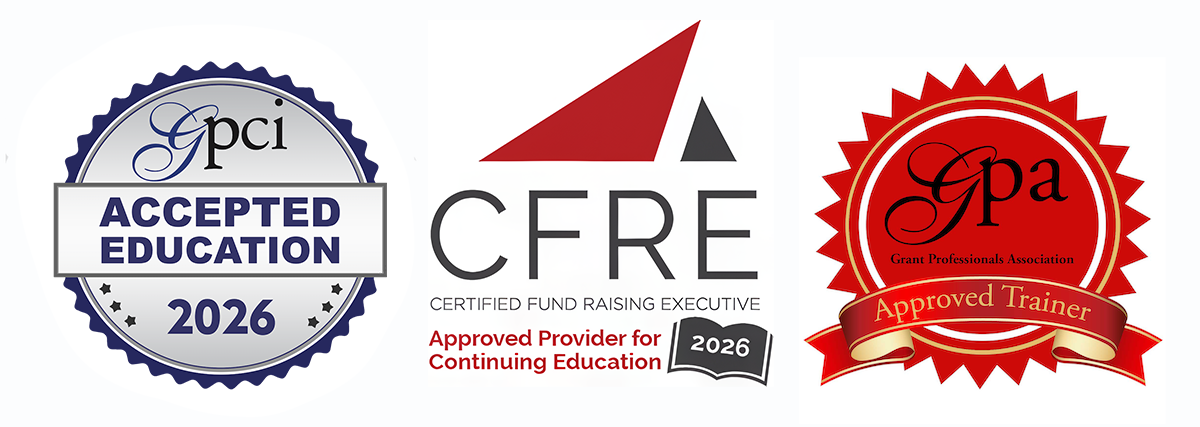 The trainers for these sessions are all credentialed grant professionals (GPCs) through the Grant Professional Certification Institute, Approved Trainers with the Grant Professionals Association, and/or credentialed Certified Grant Management Specialists (CGMS) through the National Grant Management Association. All of the trainings in this series align with the CGMS exam classification system and the Grant Professionals Certification Institute’s competencies and skills and are approved for Continuing Education Units (CEU) by GPCI and CFRE International.